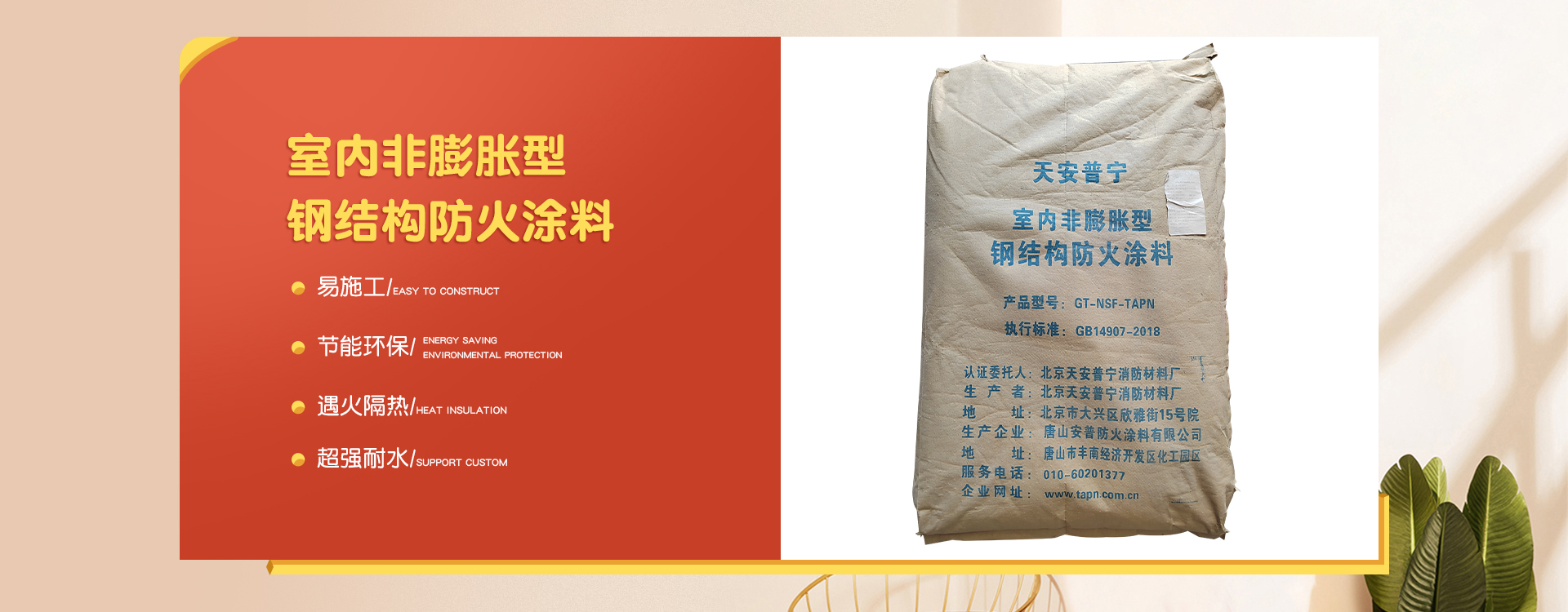 北京天安普寧消防材料廠是一家從事防火涂料二十多年生產企業,企業集研制開發、生產銷售及各類防火涂料施工為一體。 企業員工總數100人,其中管理人員20人,科研人員10人,銷售50人,其他員工十多人。企業生產用地面積2000平方米左右,辦公用地面積1000平方米。擁有先進的生產設備20多臺,年生產量10000余噸。  企業擁有一支高學歷、資歷深的研發隊伍,以科學的管理,先進成套的生產流水線設備及完善的產品質量檢驗措施,開發出TAPN系列防火涂料產品,可以滿足于各類建筑工程中不同基材、不同技術要求的防火保護,天安普寧系列防火涂料全部經過《國家消防及阻燃產品質量監督檢驗中心》檢驗,理化性能合格,防火性能高,通過《應急管理部消防產品合格評定中心》認證并獲得《消防身份信息標識》。 企業結合多年的工程施工實踐經驗,培養了一支專業有素、經驗豐富、高質量、效率高的防火涂料施工隊伍,可承攬各類高層、多層、大跨度廠房及網架鋼結構防火涂料噴涂施工服務。 企業始終為用戶全心全意服務,不斷滿足各建設單位的要求,共同為我國的建筑消防事業作出更大的貢獻,衷心感謝新老客戶的支持,全體員工熱情歡迎廣大用戶的光臨惠顧。